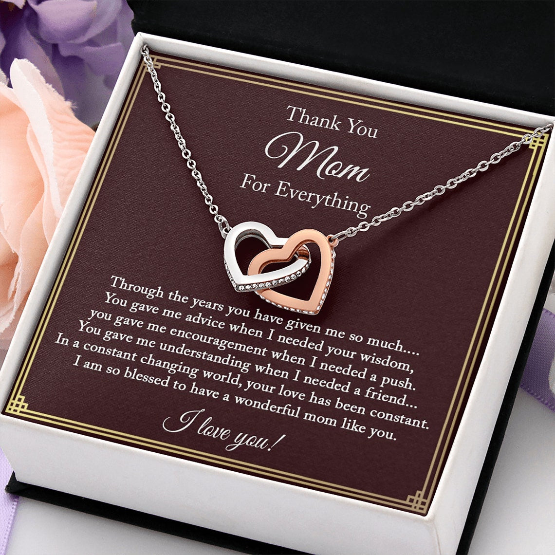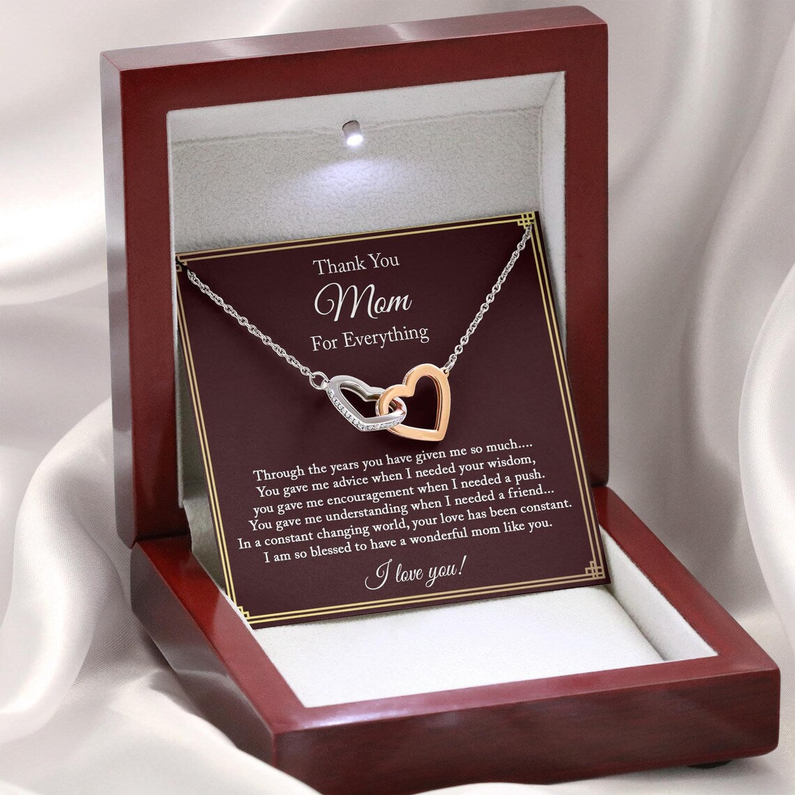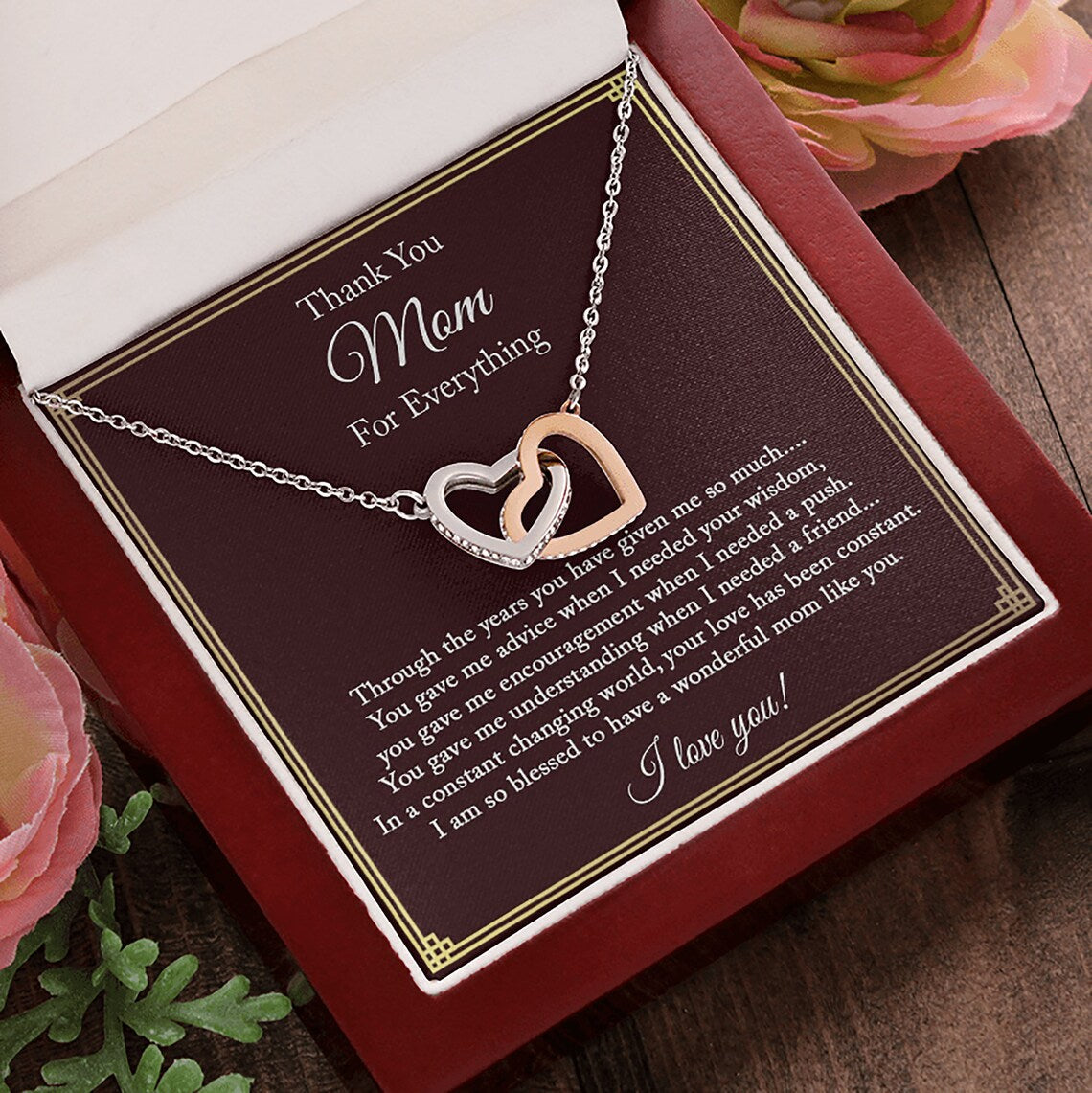 Offer your amazing mother a meaningful gift this Mother's Day. The Interlocking Hearts Necklace in a luxury box with a real rose symbolizes an unbreakable bond between two souls and is a fashionable trend. Surprise her with this lovely gift, complete with a heartfelt message card, and she'll be sure to cherish it for years.